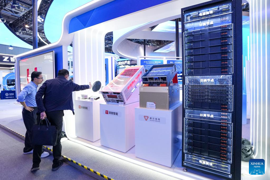 在中关村展示中心常设展上,参观者在“人工智能+”展区了解展出的AI芯片和服务器(3月25日摄)。以“科技创新与产业创新深度融合”为主题的2026中关村论坛年会日前在北京开幕。论坛年会期间,中关村展示中心常设展以“科技创新与产业创新深度融合”为主题,集中展示350多家单位在人工智能+、具身智能、高端医疗器械等前沿科技领域的560余项技术、产品,体现北京市以科技创新引领新质生产力发展,建设现代化产业体系的最新成果。[新华社记者 鞠焕宗 摄]