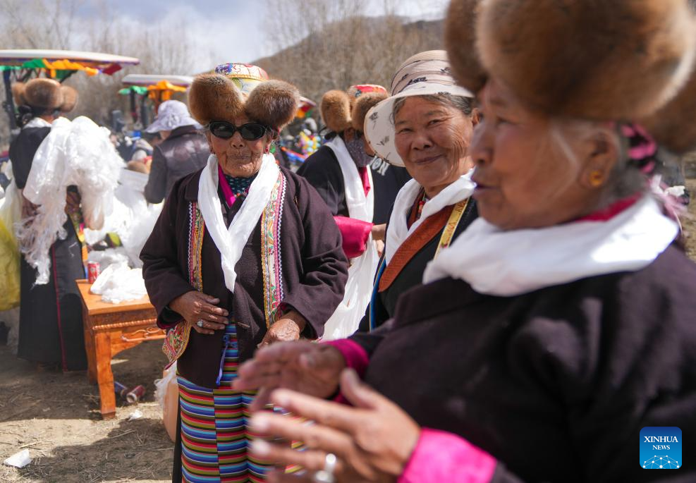 Ngawang Drolma (L) talks with villagers during a spring ploughing ceremony in Kyerpa Village of Shannan City, southwest China's Xizang Autonomous Region, March 16, 2026. (Xinhua/Jigme Dorje)