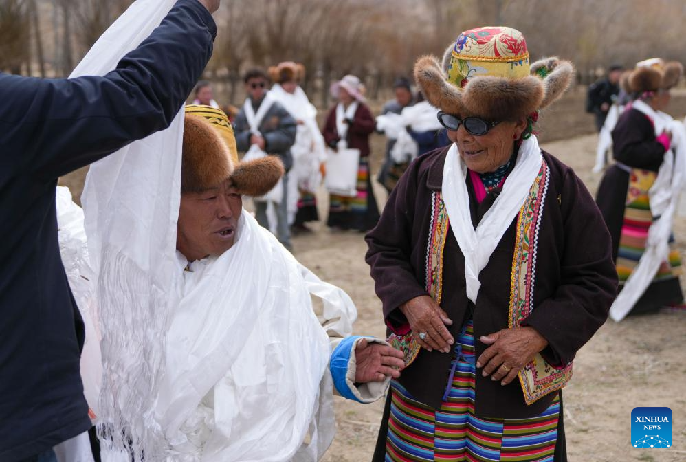 Ngawang Drolma (R) talks with villagers during a spring ploughing ceremony in Kyerpa Village of Shannan City, southwest China's Xizang Autonomous Region, March 16, 2026. (Xinhua/Jigme Dorje)