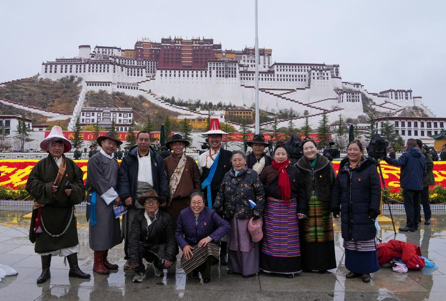 People pose for photos at the square in front of the Potala Palace in Lhasa, capital of southwest China's Xizang Autonomous Region, March 28, 2026. (Xinhua/Jigme Dorje)