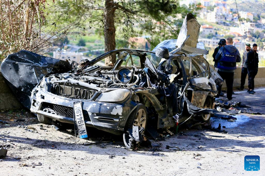 This photo taken on March 28, 2026 shows a car destroyed in an Israeli airstrike in Jezzine, southern Lebanon. [Photo/Xinhua]