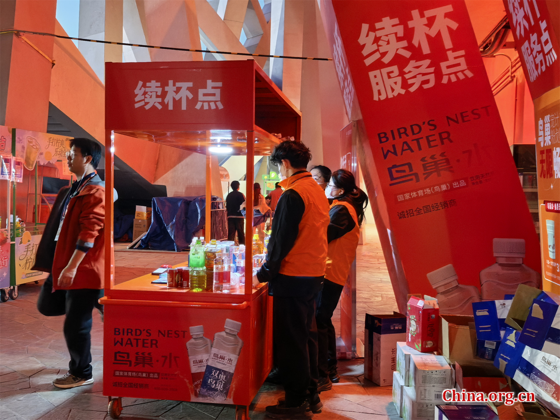 Staff members on duty at a refill station during the kickoff of Jason Zhang's concert series at the National Stadium in Beijing on March 27. These hydration points are a key part of the National Stadium's new "one-stop" service model, ensuring spectators stay refreshed throughout the three-hour performance. [Photo by Li Congrong/China.org.cn]
