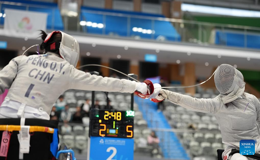 Gu Haiyan (R) of Shanghai and Peng Qiyuan of Shanghai compete during the final of the women's sabre individual category A wheelchair fencing at China's 12th National Games for Persons with Disabilities and the 9th National Special Olympic Games in Hong Kong, south China, Dec. 13, 2025. (Xinhua/Hou Zhaokang)