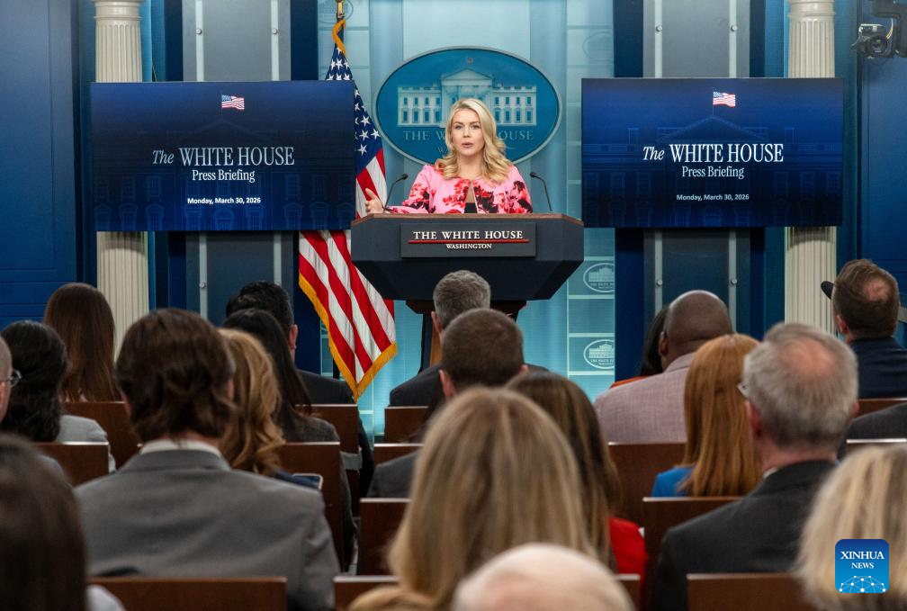 White House Press Secretary Karoline Leavitt speaks during a press briefing at the White House in Washington, D.C., the United States, March 30, 2026. [Photo/Xinhua]