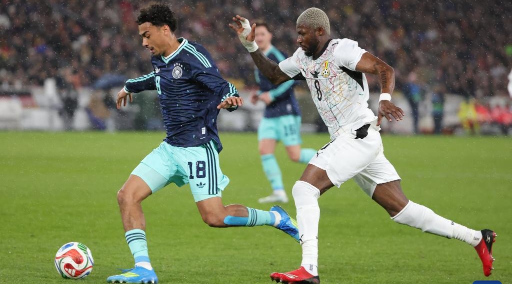 Benjamin Asare (C), goalkeeper of Ghana competes during an international friendly football match between Germany and Ghana in Stuttgart, Germany, March 30, 2026. (Photo by Philippe Ruiz/Xinhua)
