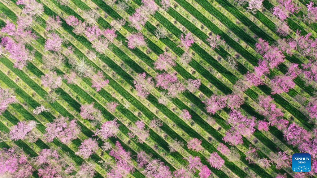 An aerial drone photo taken on March 28, 2026 shows bauhinia blossoms in Xuchang, central China's Henan province. (Photo by Niu Shupei/Xinhua)