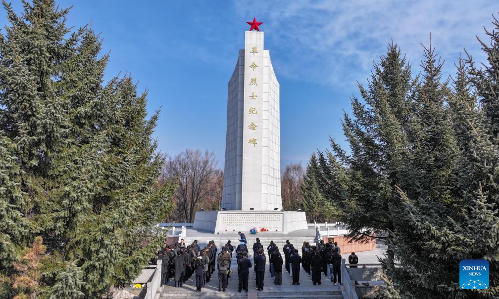 An aerial drone photo taken on April 1, 2026 shows people paying tribute to martyrs at a monument to martyrs in Suifenhe City, northeast China's Heilongjiang province. People across the country attended various activities to pay tribute to martyrs ahead of the Qingming Festival, or Tomb-Sweeping Day, which falls on April 5 this year. (Photo by Qu Yiwei/Xinhua)