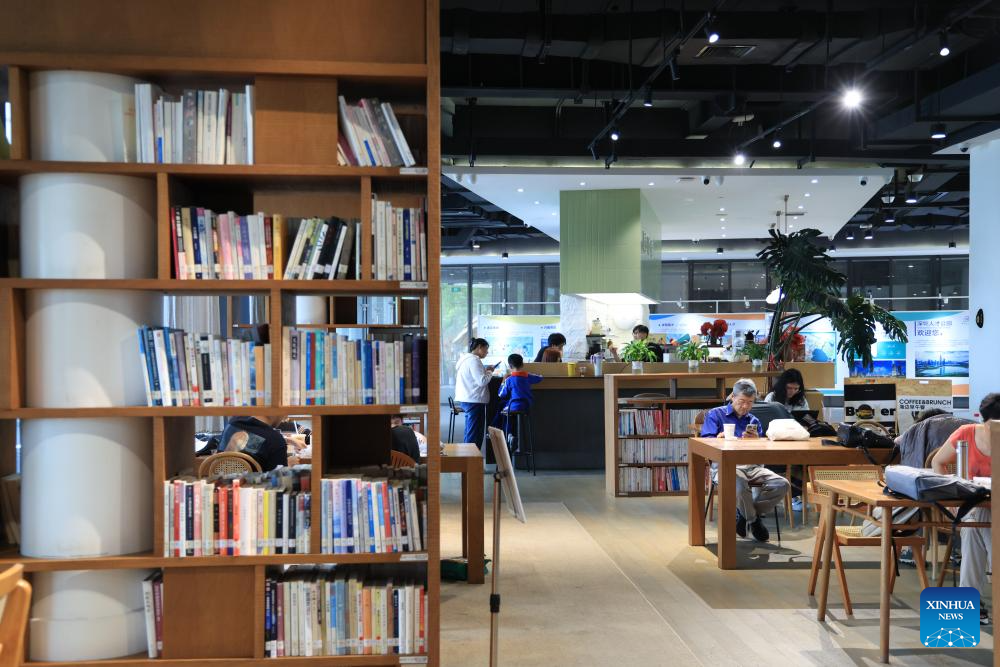 Tourists read and enjoy food at a book bar of Shenzhen talent park in Shenzhen, south China's Guangdong Province, April 1, 2026. In recent years, Shenzhen has enriched citizens' park experience by adding diverse functions to traditional parks. As part of this effort, the city has launched the "Park BOX" project at Shenzhen Bay Park, which features multiple public spaces combined with art design and convenient supporting facilities such as book bars and drone delivery services. Shenzhen has also leveraged resources from surrounding commercial areas to better integrate ecological spaces into urban life, meeting the public's demand for diverse, high-quality park experiences. (Xinhua/Mao Siqian)