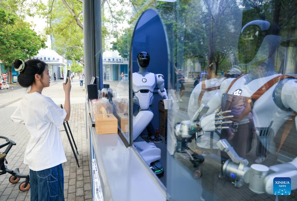 Robots prepare drinks for a tourist at Shenzhen talent park in Shenzhen, south China's Guangdong Province, April 1, 2026. In recent years, Shenzhen has enriched citizens' park experience by adding diverse functions to traditional parks. As part of this effort, the city has launched the "Park BOX" project at Shenzhen Bay Park, which features multiple public spaces combined with art design and convenient supporting facilities such as book bars and drone delivery services. Shenzhen has also leveraged resources from surrounding commercial areas to better integrate ecological spaces into urban life, meeting the public's demand for diverse, high-quality park experiences. (Xinhua/Mao Siqian)