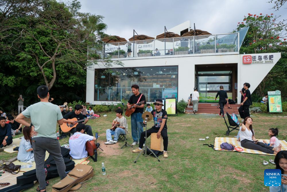 Tourists enjoy leisure time outside a book bar of Shenzhen Bay Park in Shenzhen, south China's Guangdong Province, March 29, 2026. In recent years, Shenzhen has enriched citizens' park experience by adding diverse functions to traditional parks. As part of this effort, the city has launched the "Park BOX" project at Shenzhen Bay Park, which features multiple public spaces combined with art design and convenient supporting facilities such as book bars and drone delivery services. Shenzhen has also leveraged resources from surrounding commercial areas to better integrate ecological spaces into urban life, meeting the public's demand for diverse, high-quality park experiences. (Xinhua/Mao Siqian)