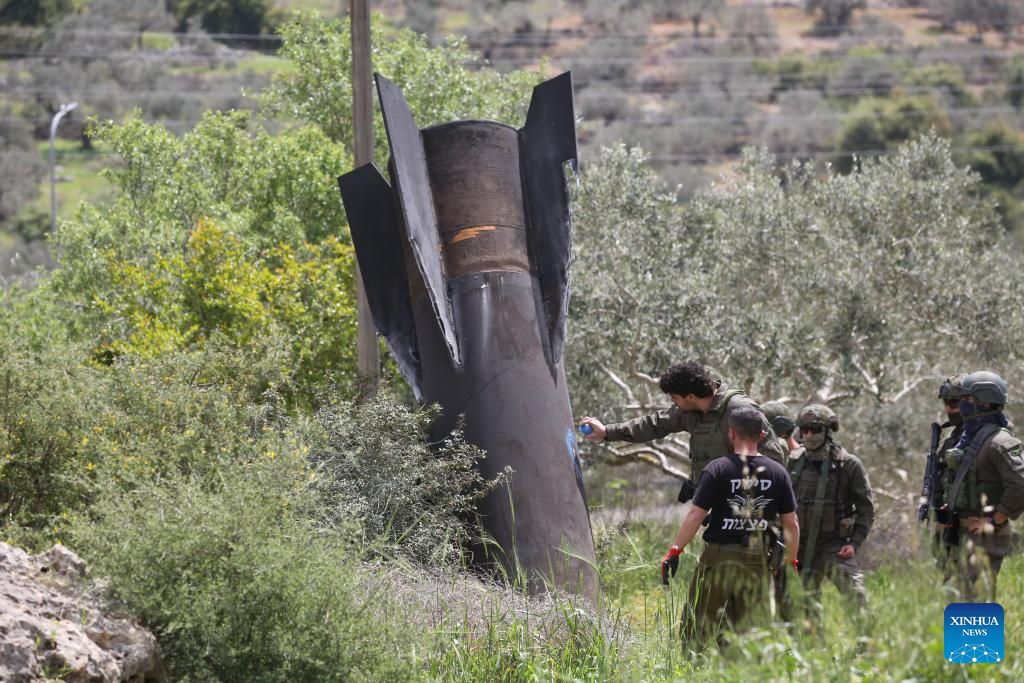 Israeli soldiers stand guard near the wreckage of a missile which fell in the town of Haris, north of Salfit in the West Bank, on March 24, 2026. [Photo/Xinhua]