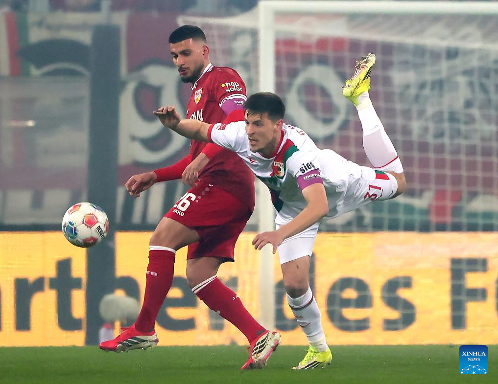 Deniz Undav (L) of VfB Stuttgart vies with Keven Schlotterbeck of FC Augsburg during the German first division Bundesliga football match between VfB Stuttgart and FC Augsburg in Augsburg, Germany, March 22, 2026. (Photo by Philippe Ruiz/Xinhua)