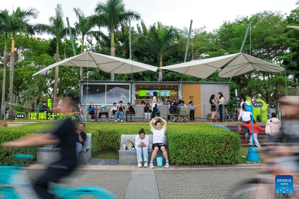 Tourists enjoy drinks at a store under the "Park BOX" project at Shenzhen Bay Park in Shenzhen, south China's Guangdong province, March 29, 2026. In recent years, Shenzhen has enriched citizens' park experience by adding diverse functions to traditional parks. As part of this effort, the city has launched the "Park BOX" project at Shenzhen Bay Park, which features multiple public spaces combined with art design and convenient supporting facilities such as book bars and drone delivery services. Shenzhen has also leveraged resources from surrounding commercial areas to better integrate ecological spaces into urban life, meeting the public's demand for diverse, high-quality park experiences. (Xinhua/Mao Siqian)