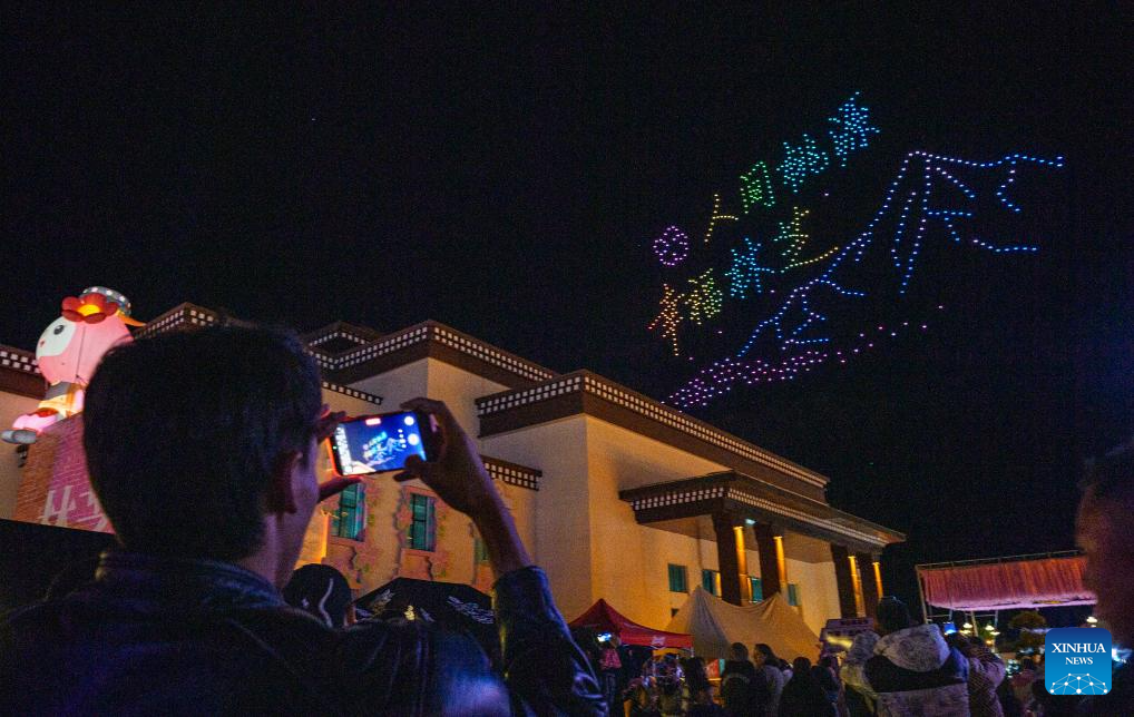 People watch a drone show at the opening ceremony of a peach blossom tourism and cultural festival in Nyingchi, southwest China's Xizang Autonomous Region, April 3, 2026. A peach blossom tourism and cultural festival kicked off in Nyingchi on Friday. More than 20 activities are scheduled to be held during the event. (Xinhua/Tenzin Nyida)