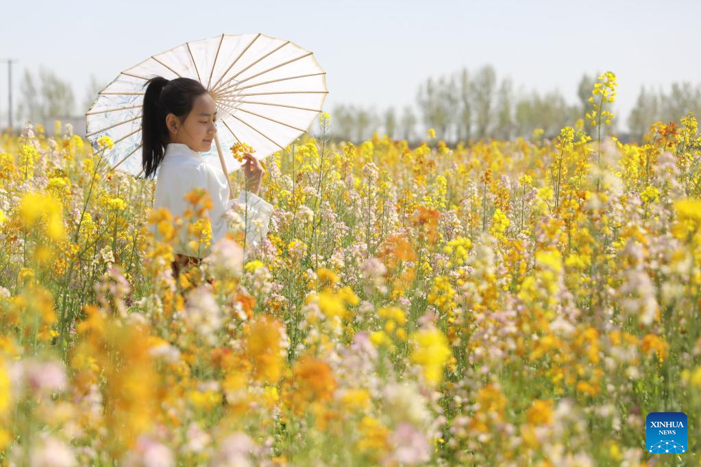 A tourist poses for a photo in a cole flower field during the Qingming Festival holiday in Wenxian County of Jiaozuo, central China's Henan Province, April 4, 2026. (Photo by Xu Hongxing/Xinhua)