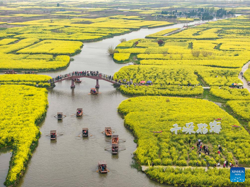 An aerial drone photo taken on April 4, 2026 shows people enjoying blossoms at a scenic area during the Qingming Festival holiday in Xinghua City, east China's Jiangsu Province. (Photo by Gu Jihong/Xinhua)