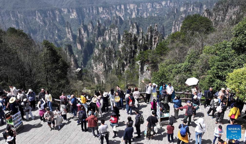 An aerial drone photo taken on April 4, 2026 shows tourists visiting Zhangjiajie National Forest Park during the Qingming Festival holiday in Zhangjiajie, central China's Hunan Province. (Photo by Wu Yongbing/Xinhua)