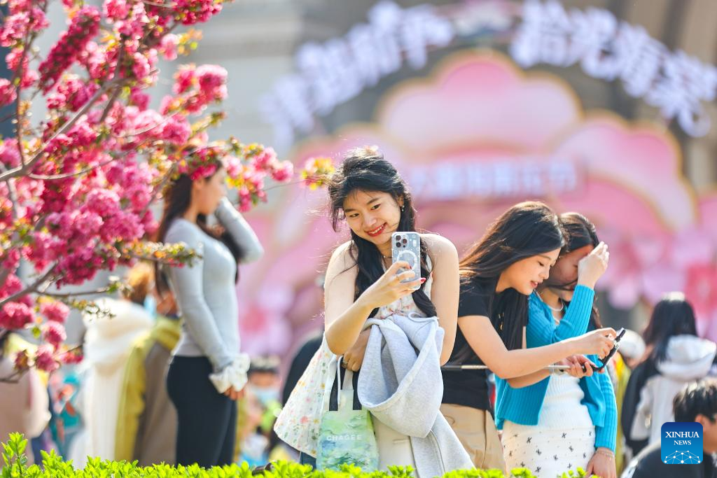 Tourists enjoy crabapple blossoms as they visit a crabapple blossom festival at the Wudadao historical urban area in north China's Tianjin, April 4, 2026. A crabapple blossom festival is ongoing at Tianjin's Wudadao historical urban area from April 3 to 12, giving a boost to the local cultural and tourism industry. (Photo by Du Penghui/Xinhua)
