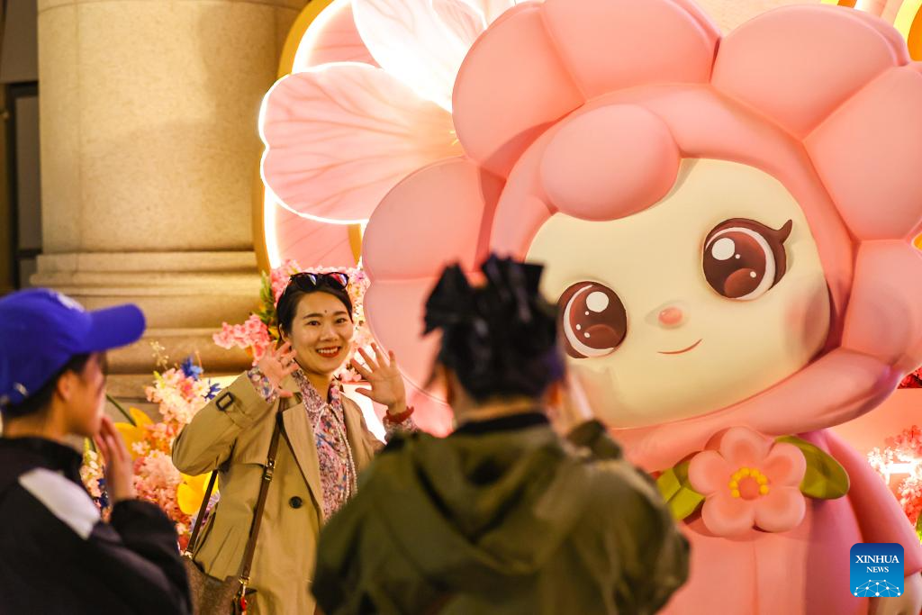A tourist poses for a photo with Tang Tang, the mascot of a crabapple blossom festival, at the Wudadao historical urban area in north China's Tianjin, April 3, 2026. A crabapple blossom festival is ongoing at Tianjin's Wudadao historical urban area from April 3 to 12, giving a boost to the local cultural and tourism industry. (Photo by Du Penghui/Xinhua)