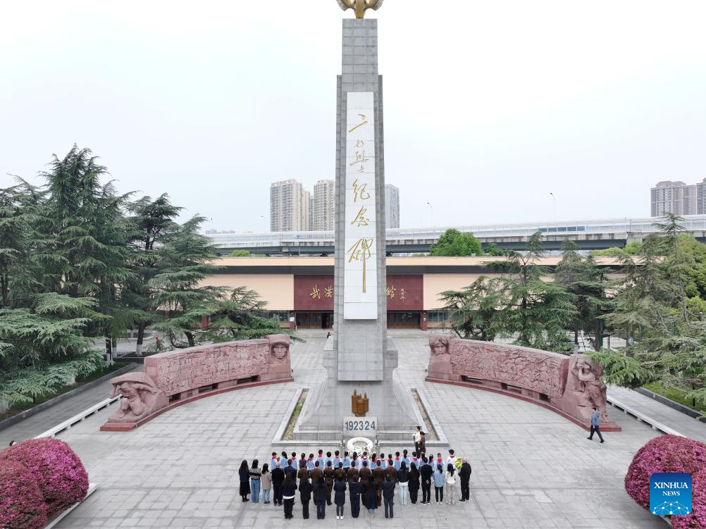 An aerial drone photo taken on April 5, 2026 shows people paying tribute to martyrs at a martyrs' cemetery in Wuhan, central China's Hubei Province. People across the country attended various activities to pay tribute to martyrs during the Qingming Festival, or Tomb-Sweeping Day, on Sunday this year. (Photo by Zhao Jun/Xinhua)