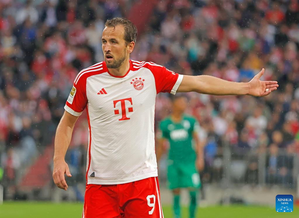 Harry Kane of Bayern Munich reacts during the German first division Bundesliga football match between Bayern Munich and FC Augsburg in Munich, Germany, Aug. 27, 2023. (Photo by Philippe Ruiz/Xinhua)