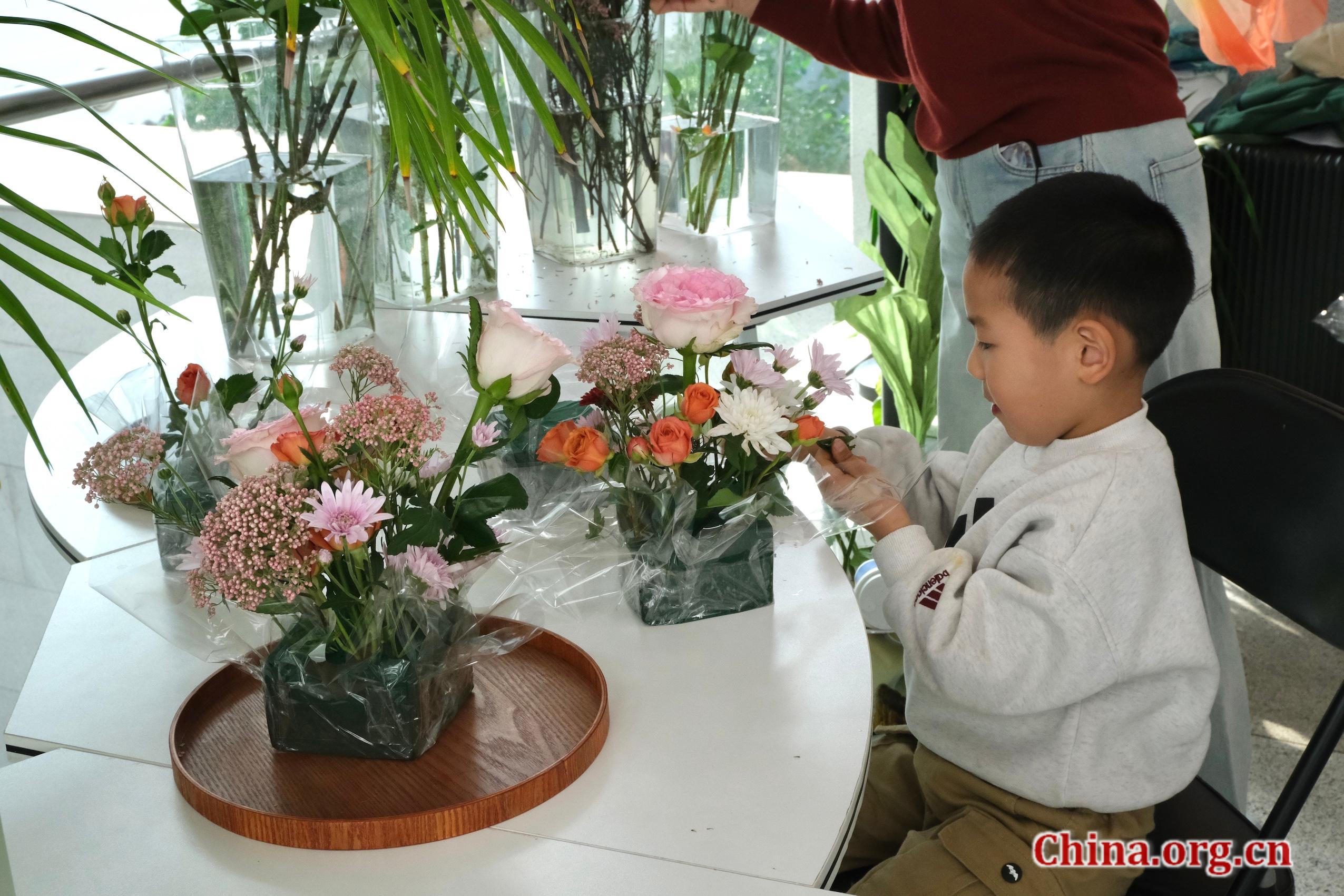 A boy arranges flowers at the Museum of Chinese Gardens and Landscape Architecture, Beijing, April 5, 2026. [Photo by Liao Jiaxin/China.org.cn]