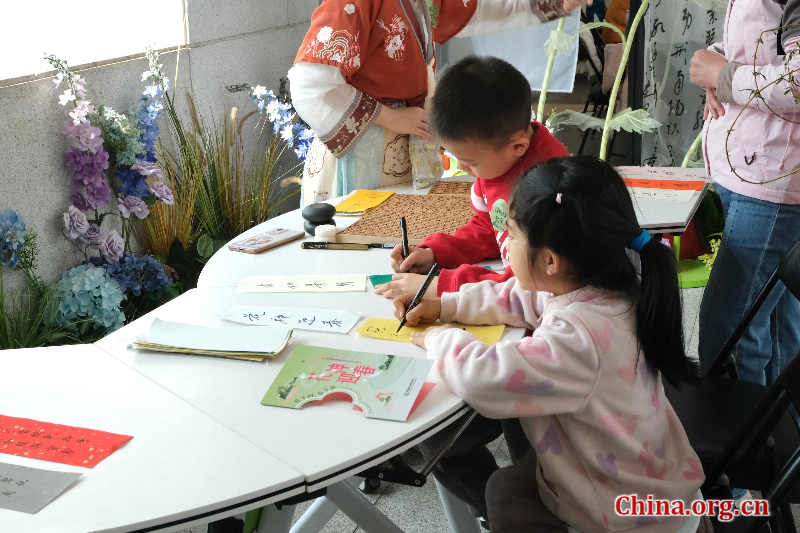 Children learn to write words related to spring at the Museum of Chinese Gardens and Landscape Architecture, Beijing, April 5, 2026. [Photo by Liao Jiaxin/China.org.cn]