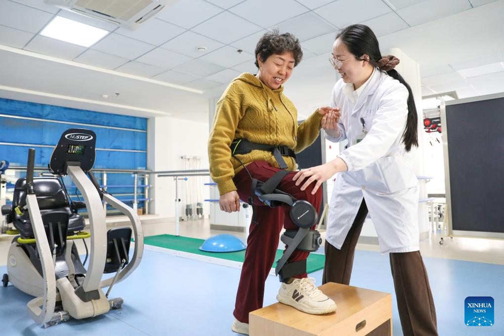 A patient wearing an exoskeleton robot conducts rehabilitation training under the guidance of a therapist at a traditional Chinese medicine hospital in Hai'an City, east China's Jiangsu province, April 7, 2026. The World Health Day is observed annually on April 7, which marks the anniversary of the WHO's founding and raises awareness of pressing global health issues. (Photo by Gu Binbin/Xinhua)
