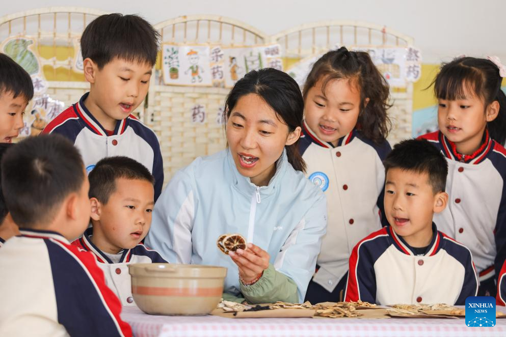 A teacher teaches the children to recognize traditional Chinese medicinal herbs at a kindergarten in Qingdao, east China's Shandong province, April 7, 2026. The World Health Day is observed annually on April 7, which marks the anniversary of the WHO's founding and raises awareness of pressing global health issues. (Photo by Zhang Ying/Xinhua)