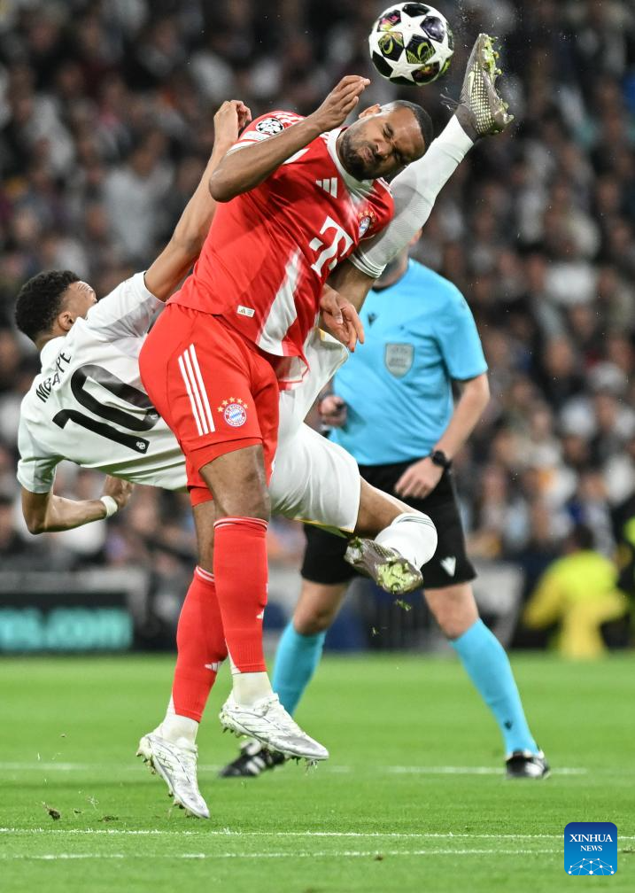 Kylian Mbappe (L) of Real Madrid vies with Jonathan Tah of Bayern Munich during the 2025/2026 UEFA Champions League quarterfinal first leg football match between Real Madrid and Bayern Munich in Madrid, Spain, April 7, 2026. (Xinhua/Cheng Min)