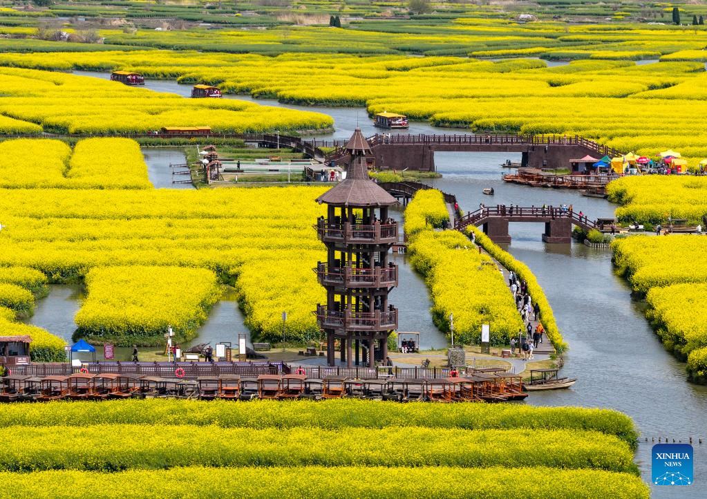 An aerial drone photo taken on April 8, 2026 shows people visiting a scenic spot for sightseeing in Xinghua City, east China's Jiangsu province. (Photo by Zhou Shegen/Xinhua)