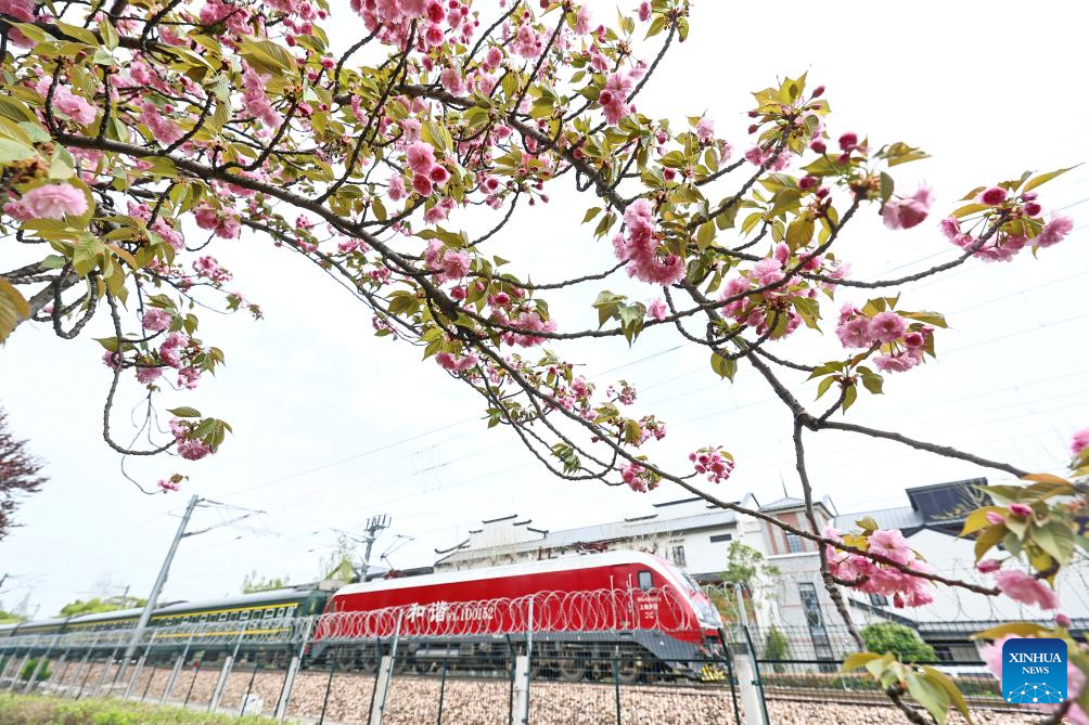 A train drives past cherry blossoms in Jiaxing City of east China's Zhejiang province, April 8, 2026. (Photo by Jin Peng/Xinhua)