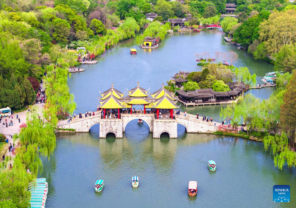 An aerial drone photo taken on April 7, 2026 shows people visiting the Slender West Lake scenic spot in Yangzhou, east China's Jiangsu province. (Photo by Ren Fei/Xinhua)