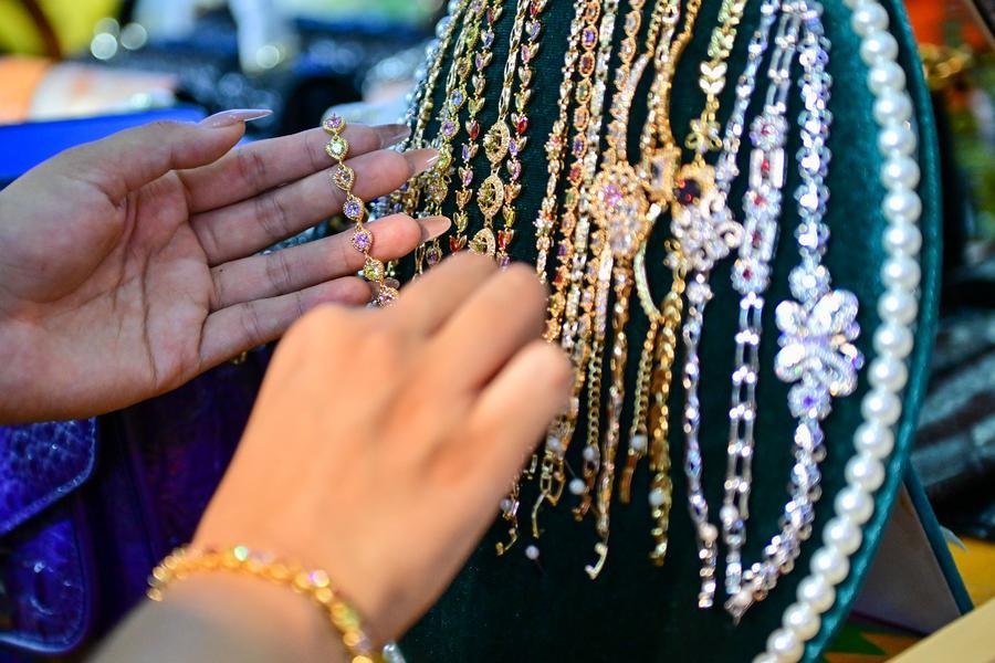 A visitor selects bracelets in the Ghana booth at the 8th China-Eurasia Expo in Urumqi, northwest China's Xinjiang Uygur Autonomous Region, June 27, 2024. [Photo/Xinhua]