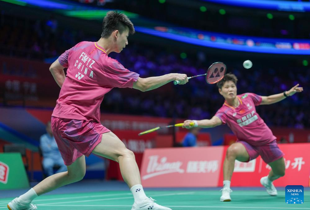 Feng Yanzhe (L)/Huang Dongping of China compete during the mixed doubles round of 16 match against Amri Syahnawi/Nita Violina Marwah of Indonesia at Badminton Asia Championships 2026 in Ningbo, east China's Zhejiang Province, April 9, 2026. (Xinhua/Sun Fei)