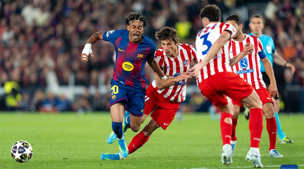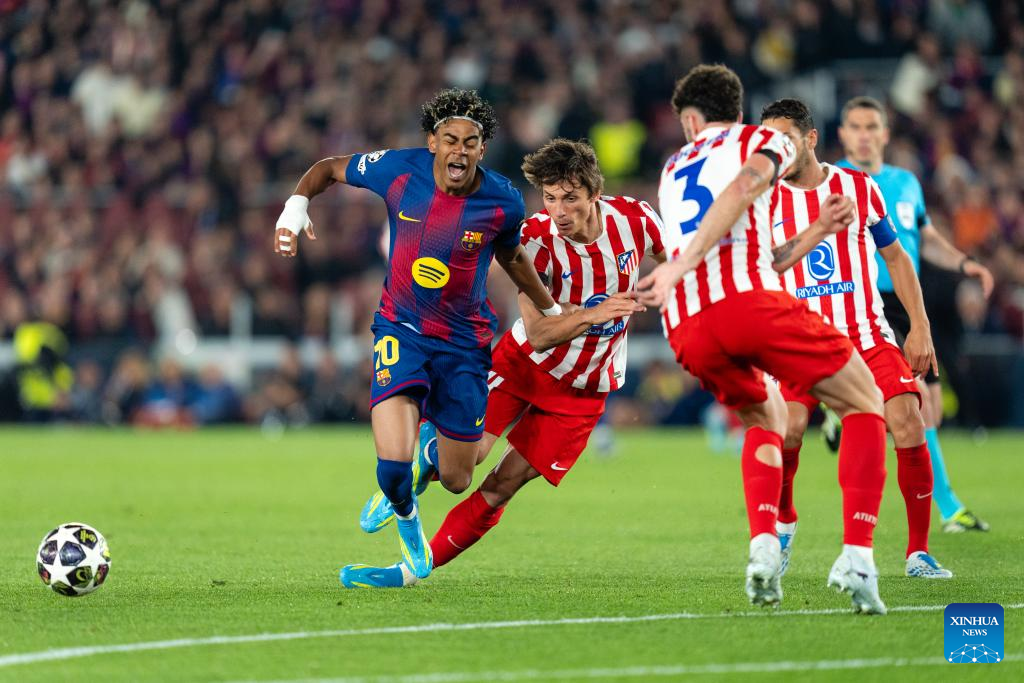 FC Barcelona's Lamine Yamal (1st L) vies with Atletico de Madrid's Robin Le Normand (2nd L) during the 2025/2026 UEFA Champions League quarterfinal first leg football match between FC Barcelona and Atletico de Madrid in Barcelona, Spain, April 8, 2026. (Photo by Joan Gosa/Xinhua)