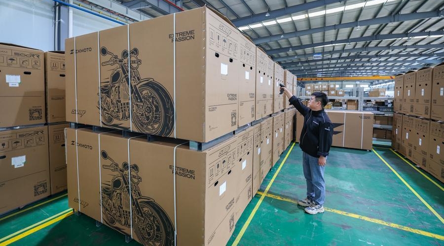 A staff member inspects the motorcycles for export at the factory building of ZXMOTO in Liangjiang New Area, southwest China's Chongqing, April 1, 2026. [Photo/Xinhua]