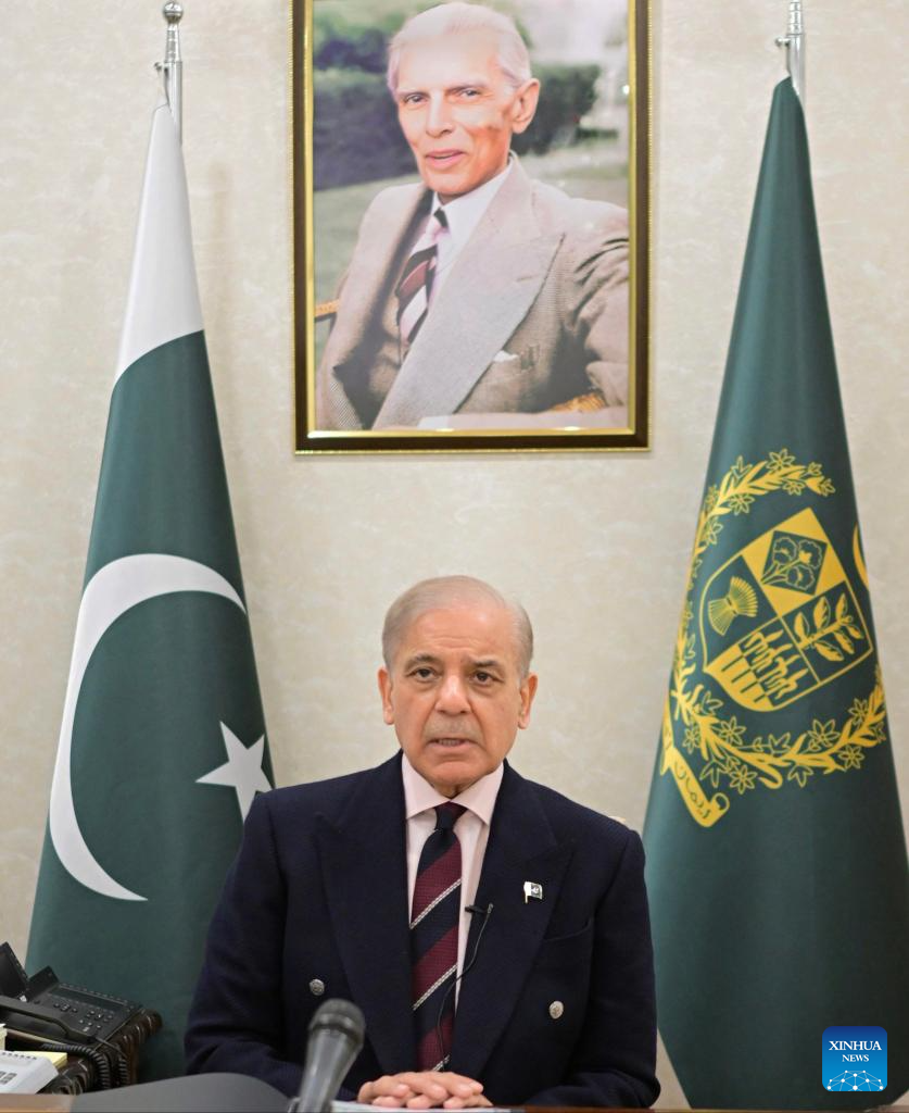 Pakistani Prime Minister Shehbaz Sharif delivers a speech on TV in Islamabad, Pakistan, April 10, 2026. [Photo/Xinhua]
