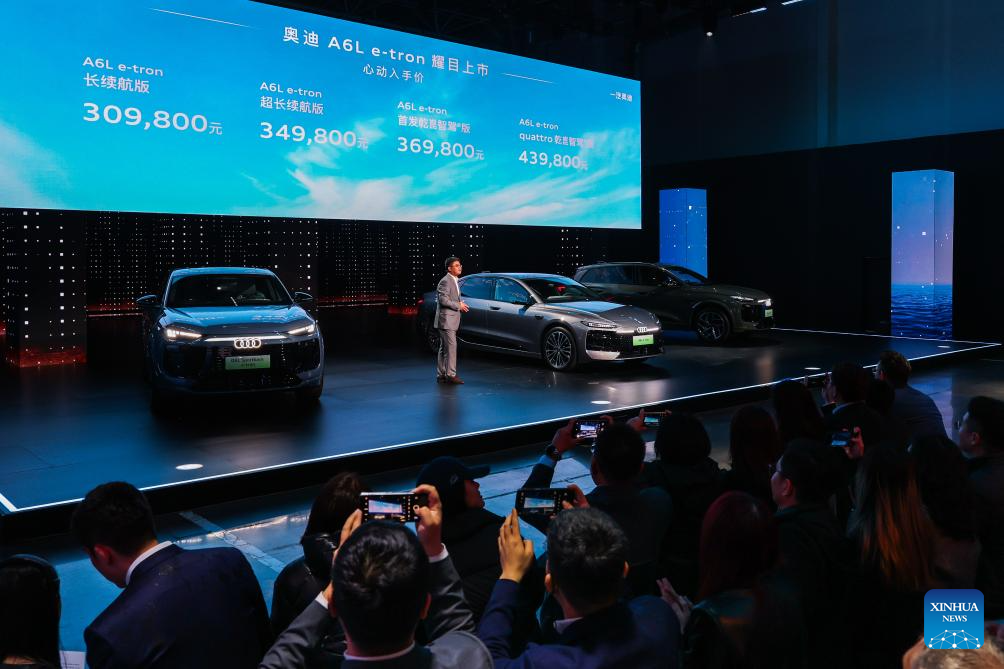 This photo taken on April 10, 2026 shows a launch event for the A6L e-tron, a battery-electric vehicle, making its debut in the Chinese market at Audi FAW NEV Co., Ltd. in Changchun, northeast China's Jilin Province. [Photo/Xinhua]