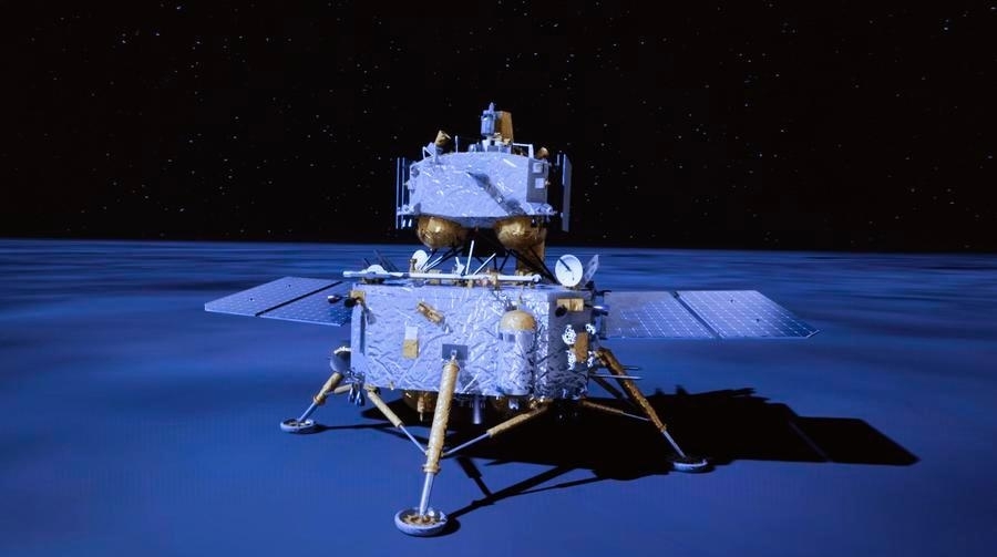 This image taken from video animation at Beijing Aerospace Control Center on June 2, 2024 shows the lander-ascender combination of Chang'e-6 probe landing on the far side of the moon. [Photo/Xinhua]