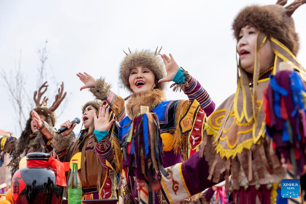 Performers from the Hezhe ethnic group shout to "awaken" the river at the Hanjiang festival in Jiamusi, northeast China's Heilongjiang Province, April 10, 2026.