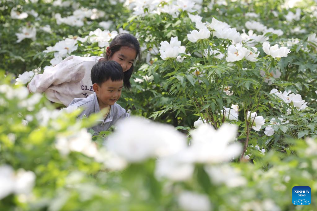 Children play amid flowers in Jiaozuo City, central China's Henan province, April 12, 2026. (Photo by Xu Hongxing/Xinhua)