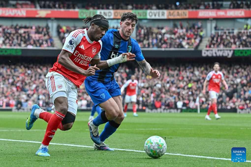 Arsenal's Noni Madueke (L) vies with Bournemouth's Marcos Senesi during the English Premier League match between Arsenal and Bournemouth in London, Britain, April 11, 2026. (Xinhua)