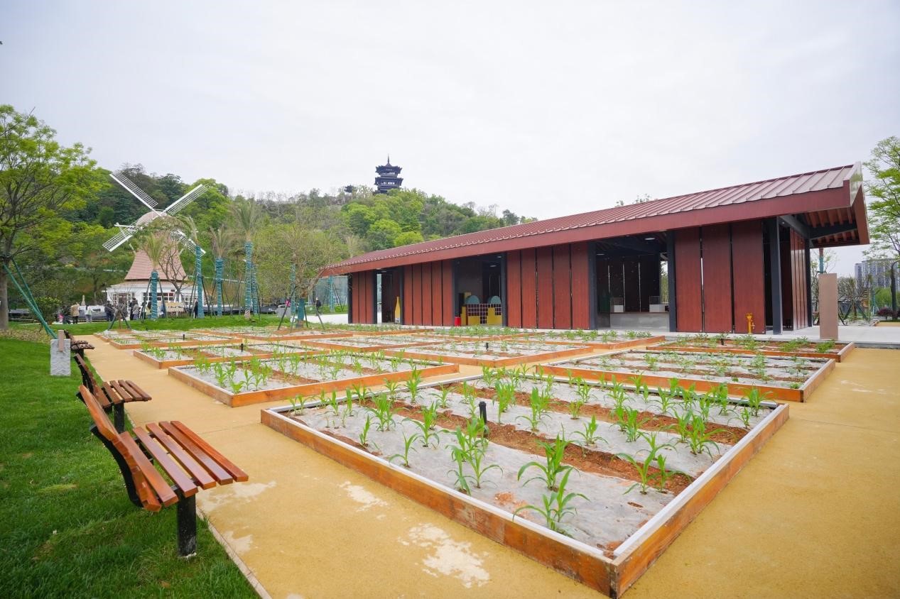 A timber pavilion serves as the focal point of the garden. It draws inspiration from simple wooden cabins in U.S. national parks while incorporating a modern minimalist design. The structure provides a place for visitors to sit and experience nature more directly, reflecting a design approach that shifts away from landmark-style architecture and focuses instead on everyday human interaction with the natural environment.