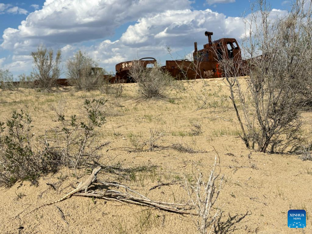 A lizard stands beside the "ship cemetery" in Moynaq, Uzbekistan, April 10, 2026. The "ship cemetery" displays the wrecks of ships abandoned as a result of the Aral Sea crisis. Situated between Kazakhstan and Uzbekistan, the Aral Sea, once the world's fourth-largest lake, continues to shrink and has lost more than 90 percent of its original surface area since the 1960s, leaving behind vast stretches of desertified lakebed. (Xinhua/Jiang Hexuan)