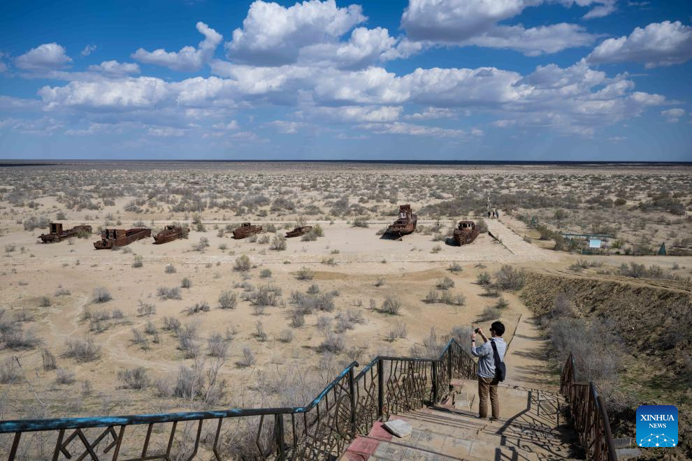 A tourist takes photos of the "ship cemetery" in Moynaq, Uzbekistan, April 10, 2026. The "ship cemetery" displays the wrecks of ships abandoned as a result of the Aral Sea crisis. Situated between Kazakhstan and Uzbekistan, the Aral Sea, once the world's fourth-largest lake, continues to shrink and has lost more than 90 percent of its original surface area since the 1960s, leaving behind vast stretches of desertified lakebed. (Xinhua/Li Renzi)