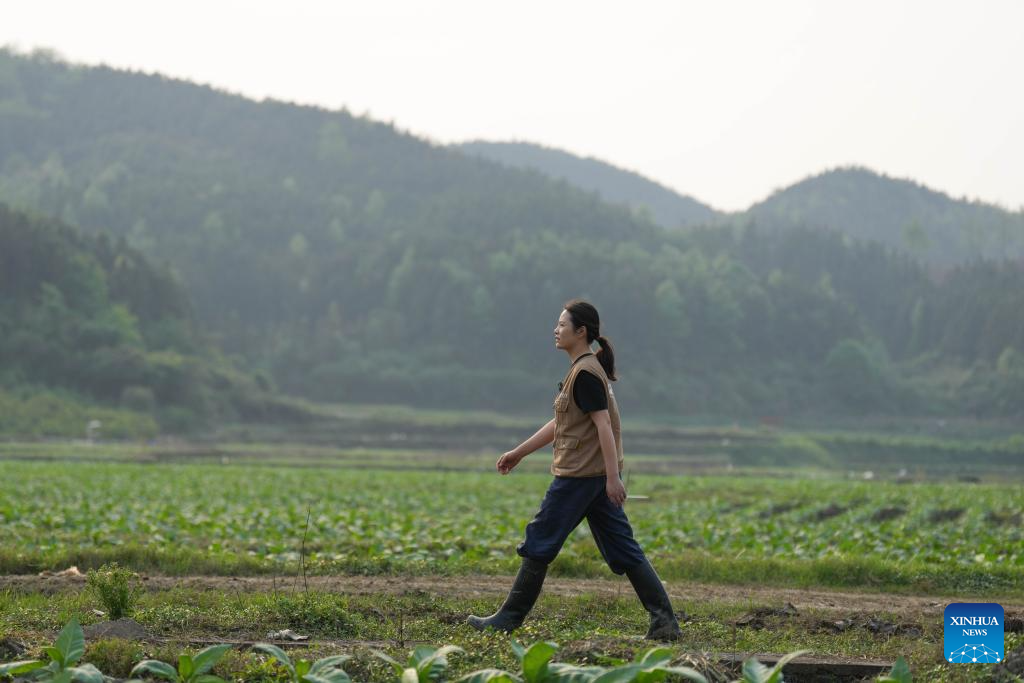 Luo Yu walks in fields in Huatang Town in Chenzhou, central China's Hunan Province, on April 9, 2026. (Xinhua/Xue Yuge)