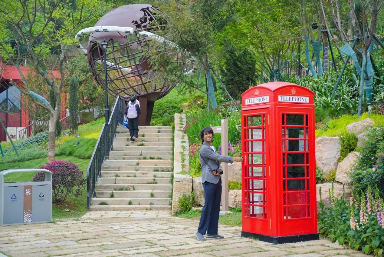 At the entrance, a rust-colored globe sculpture evokes the legacy of industrialization, while nearby elements inspired by China’s high-speed rail system symbolize modern momentum. Together, they highlight the two countries’ pasts and presents. A restored red telephone box and a traditional British post box, both brought from the U.K., add a distinctly London feel to the garden.