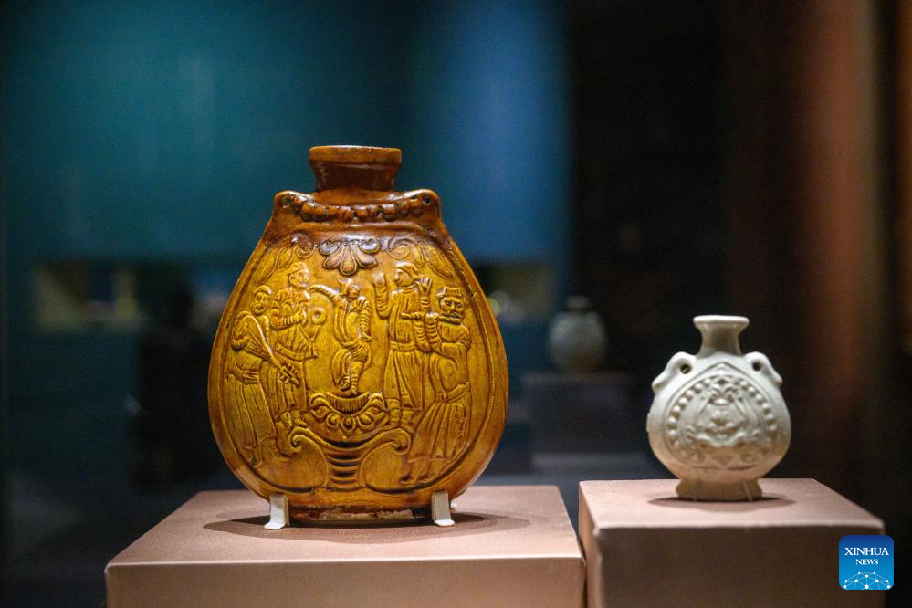 This photo taken on April 13, 2026 shows exhibits at the exhibition "A Glimpse into 6th-7th Century China: Discoveries at Li Jingxun's Tomb" at the National Museum of China in Beijing, capital of China. The ongoing exhibition features relics unearthed from the tomb of Li Jingxun, a young princess who died in 608, and recently discovered key relics from the Northern and Southern Dynasties (420-589) to the Sui Dynasty (581-618). (Xinhua/Jin Liangkuai)