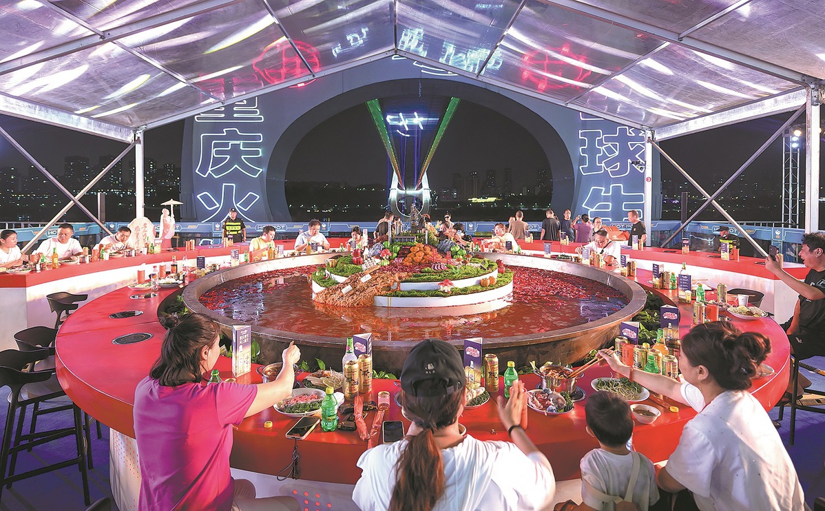 Visitors gather around a giant 10-meter-diameter hotpot to enjoy a communal meal during a hotpot-themed culture festival in Chongqing on Sept. 28, 2025. [Photo/China News Service]